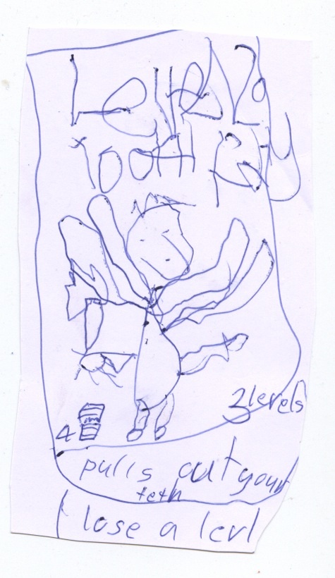 This afternoon the kids decided to make their own Munchkin cards. This is one of Tom’s creations – a Level 20 Tooth Fairy, if you defeat it you get 4 treasures and go up 3 levels, but should you lose the fight the bad stuff that happens is “pulls out your teeth, lose a level”.