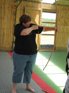 The Golden Valleys campsite is lovely, the kids (big and small) had much fun on the trampoline and in the pool. I was persuaded to join in a game of battleships which involves trying to swim past the person who is in while they try to grab you with their eyes closed. It was fun, and surprisingly strenuous! Adam got himself designated archery range supervisor and we had a good play around with the weaponry. I’m reasonably pleased with the results I got out of my longbow on her first outing but as mentioned I do need to work on my technique out of self-preservation if nothing else. Either that or get Adam to make me a full length arm guard.