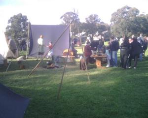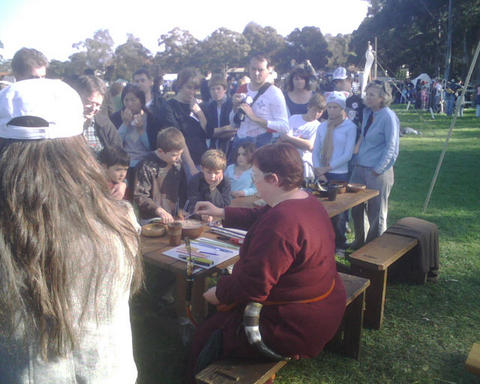 On Sunday morning Dave was up at the crack of dawn, all kitted up and ready to go. I dragged my aching butt out of bed (standing up all day in shoes with no arch support turned out to be a bad idea) and we headed off. First stop Woolworths. In costume. I was quite disappointed that no-one asked why we were dressed up. The porridge didn’t eventuate, too much like hard work when there was someone BBQing bacon and eggs just down the other end of the field. With another geteld tent, trestle table and benches added to our camp (brought by late arrivals on Saturday) I was able to set up my beadmaking kit and do a lampwork demonstration. The tripod in the foreground of this pic is made of all the really long spears which kept falling over when they were propped against the tents.