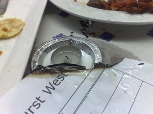 Um. You know those tealight candles on the tables? Turns out it wasn’t such a brilliant idea to have candles around when you’re going to be passing multiple sheets of paper back and forth between people. Or maybe that was just our table, no-one else seemed to have a problem 😛