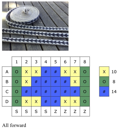 This being an “All Forward” pattern, as you weave, the warp threads in the unwoven section of your work will twist around one another eventually becoming too twisted to allow further weaving. The easiest solution to this is to simply reverse direction and turn “All Backward” which in this case will result in arrows pointing in the opposite direction. You can see a few reversal points on the band in the photo above the pattern. Patterns that have a turning sequence of “4 Forward, 4 Backward” do not suffer from this problem.